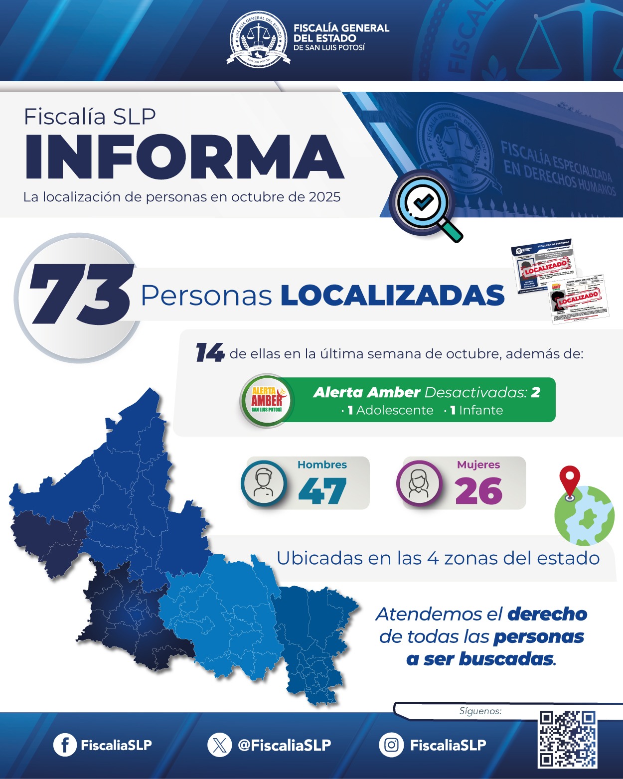 Derivado de las denuncias presentadas por familiares de personas no localizadas, la Fiscalía General del Estado de San Luis Potosí (FGESLP) logró la localización de 73 personas que contaban con ficha de búsqueda activa en la entidad.
