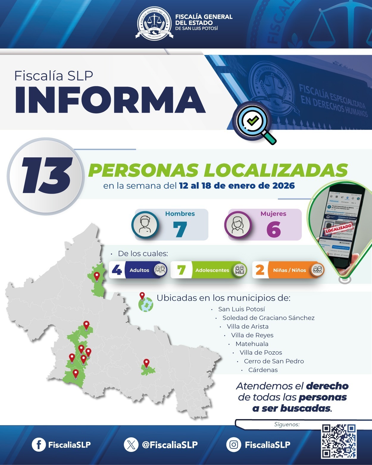 La Fiscalía General del Estado de San Luis Potosí (FGESLP) informó que, a través de la Coordinación Estatal de Alerta Amber y la Unidad de Personas No Localizadas y Desaparecidas, fueron localizadas 13 personas que contaban con ficha de búsqueda activa en la entidad.