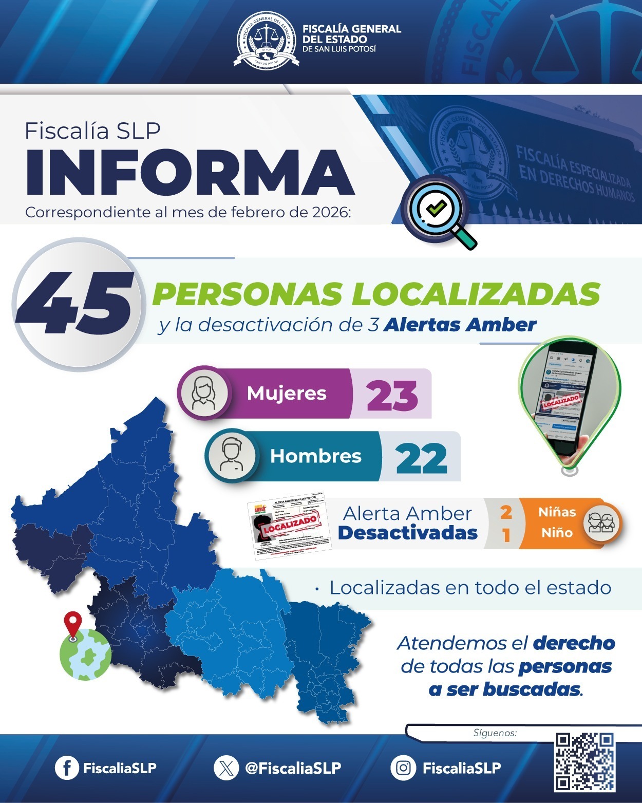 La Fiscalía General del Estado de San Luis Potosí (FGESLP) informa que, durante el mes de febrero de 2026, se obtuvieron resultados positivos en las labores de búsqueda y localización de personas reportadas como ausentes, logrando la localización de 45 personas en la entidad.