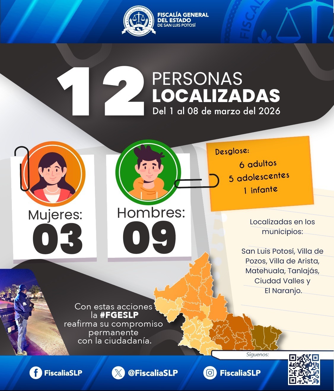 La Fiscalía General del Estado de San Luis Potosí (FGESLP) informa que, como resultado de las labores de investigación, búsqueda y localización realizadas por la Fiscalía Especializada en Materia de Derechos Humanos, se logró la reunificación de 12 personas con sus familiares, luego de confirmarse su paradero.