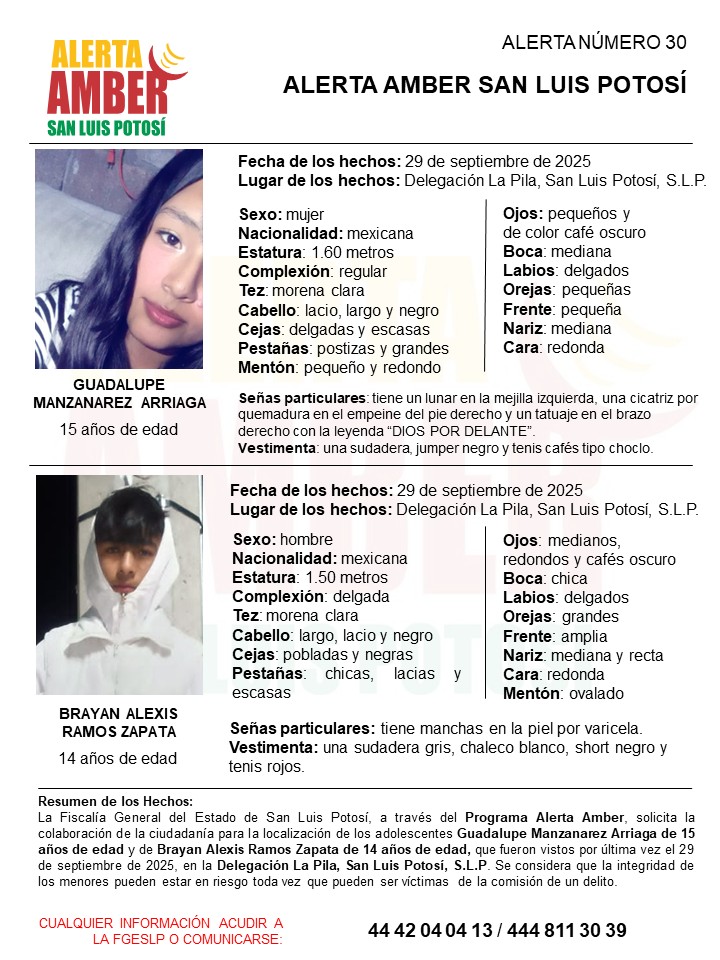 La Fiscalía General del Estado de San Luis Potosí (FGESLP) activó una ficha de Alerta Amber para la localización de Guadalupe Manzanarez Arriaga y Brayan Alexis Ramos Zapata, de 15 y 14 años de edad respectivamente, quienes fueron vistos por última vez el 29 de septiembre de 2025 en la Delegación La Pila.