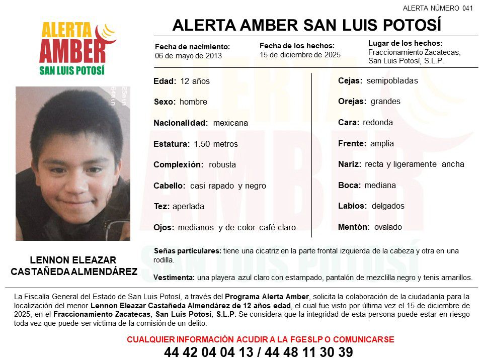 La Fiscalía General del Estado de San Luis Potosí (FGESLP) activó una ficha de Alerta Amber para la localización de Lennon Eleazar Castañeda Almendárez, quien tuvo contacto por última vez con sus familiares el 15 de diciembre de 2025, en el Fraccionamiento Zacatecas, de la capital potosina.
