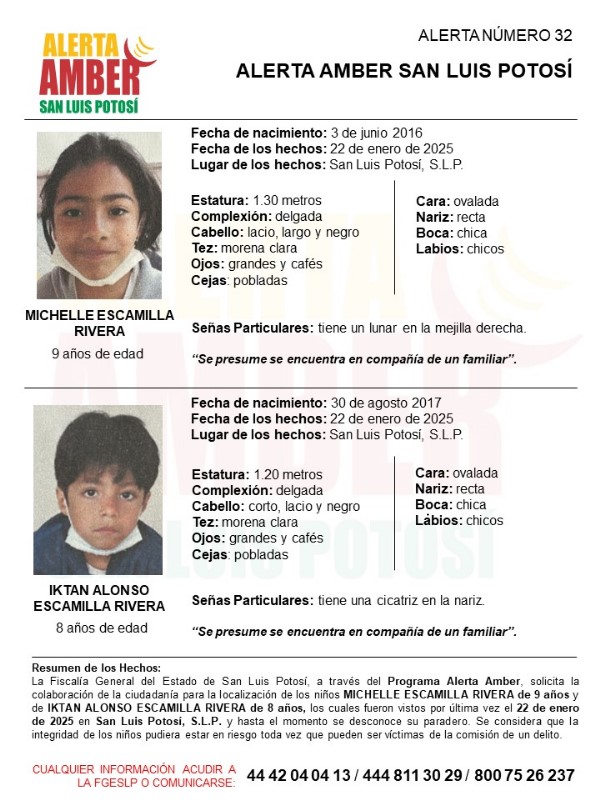 La Fiscalía General del Estado de San Luis Potosí (FGESLP) activó una ficha de Alerta Amber para la localización de Michelle Escamilla Rivera y Iktan Alonso Escamilla Rivera, de 9 y 8 años de edad, respectivamente, quienes fueron vistos por última vez el 22 de enero de 2025, en la ciudad capital.