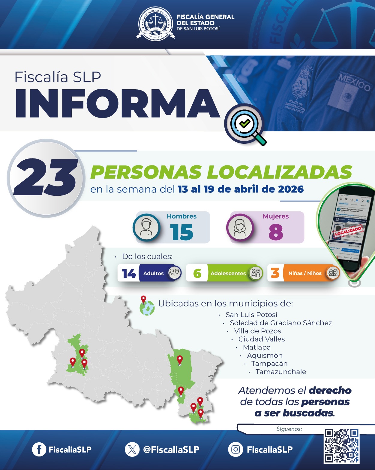 Del total de personas ubicadas, 15 corresponden a masculinos y 8 a femeninas; de ellas, se clasifican en 11 hombres, 3 mujeres, 6 adolescentes y 3 infantes, con un rango de edad que va de los 3 a los 73 años. Estas localizaciones se efectuaron durante la semana comprendida del 13 al 19 de abril de 2026, en los municipios de San Luis Potosí, Soledad de Graciano Sánchez, Villa de Pozos, Tampacán, Aquismón, Matlapa, Ciudad Valles y Tamazunchale.