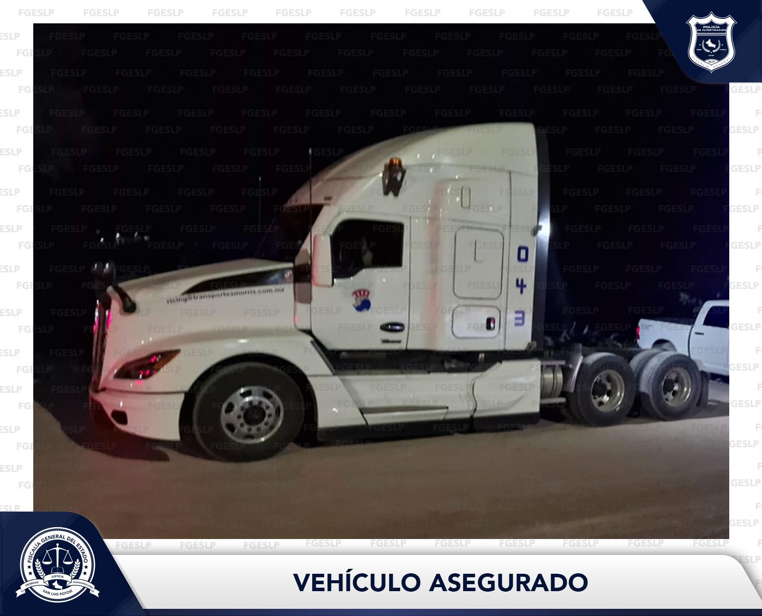 La acción se llevó a cabo en la Carretera a Escalerillas, perteneciente al municipio de la ciudad capital, donde fue asegurado un tractocamión marca Kenworth, modelo T680, color blanco, año 2024.